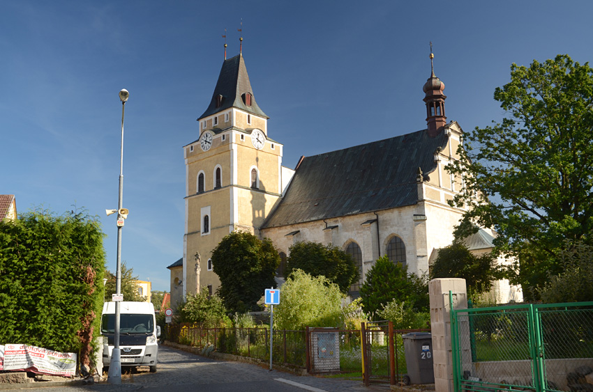 První stavbou na místě stávajícího kostela Nalezení svatého kříže byl kostel zasvěcený svaté Kateřině, který je prvně zmiňován v roce 1316 (pozůstatkem této stavby je zřejmě stavební anomálie v půdorysu současného kostela - zalomení podélné osy ve vítězném oblouku).